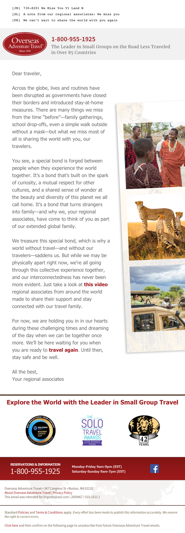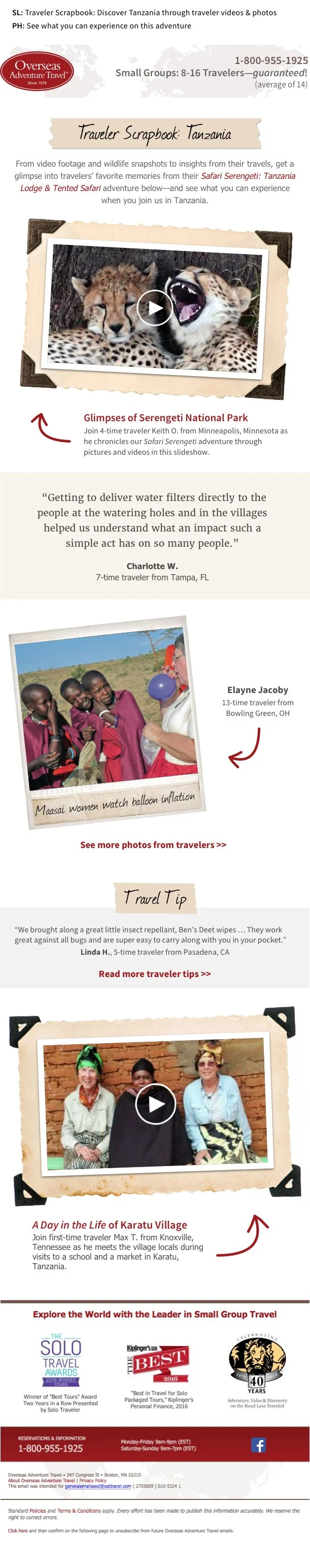 EmailA selection of marketing emails for Overseas Adventure Travel. Slide 1 Slide 1 (current slide) Slide 2 Slide 2 (current slide) Slide 3 Slide 3 (current slide) Slide 4 Slide 4 (current slide) Slide 5 Slide 5 (current slide) Slide 6 Slide 6 (current slide) Slide 7 Slide 7 (current slide) Slide 8 Slide 8 (current slide) Slide 9 Slide 9 (current slide) Slide 10 Slide 10 (current slide)